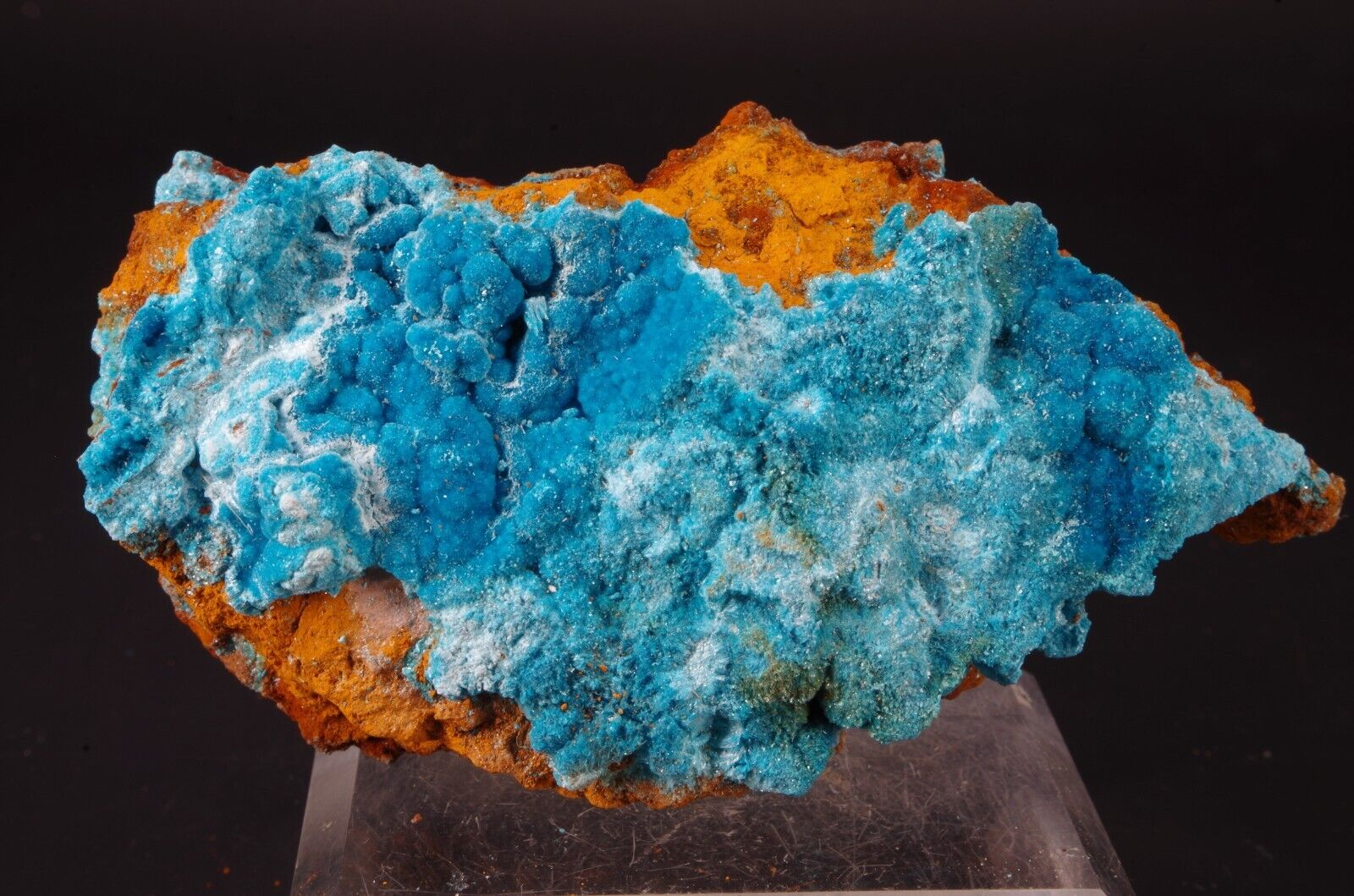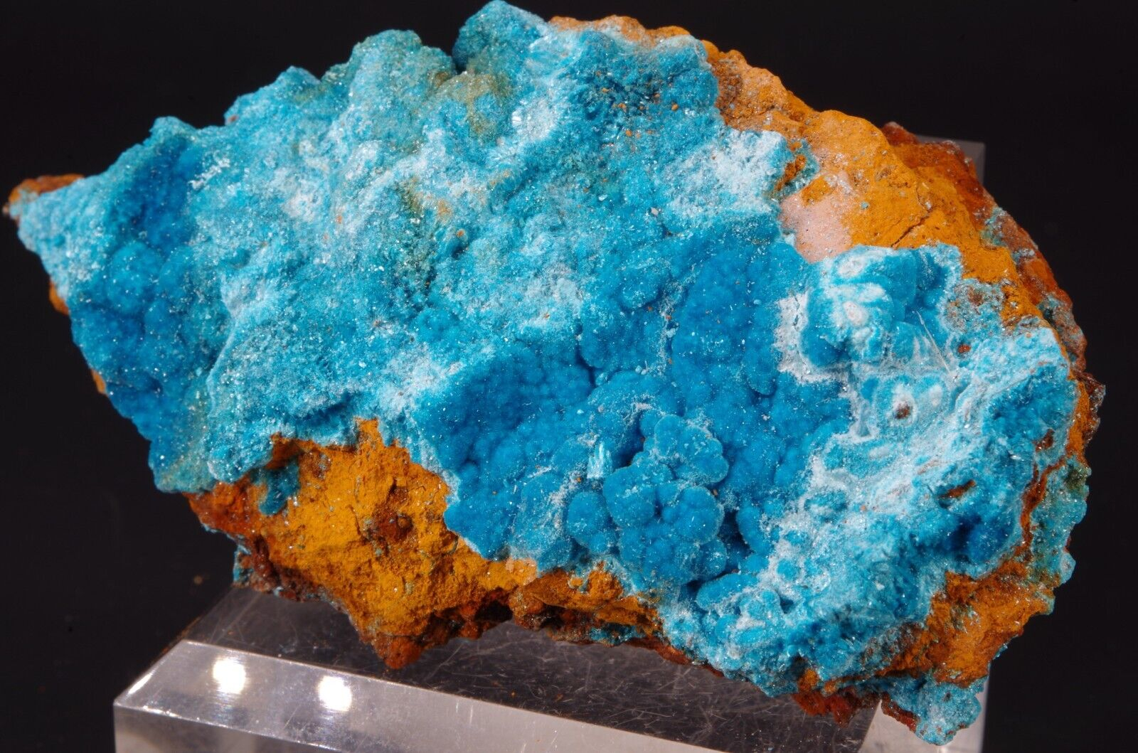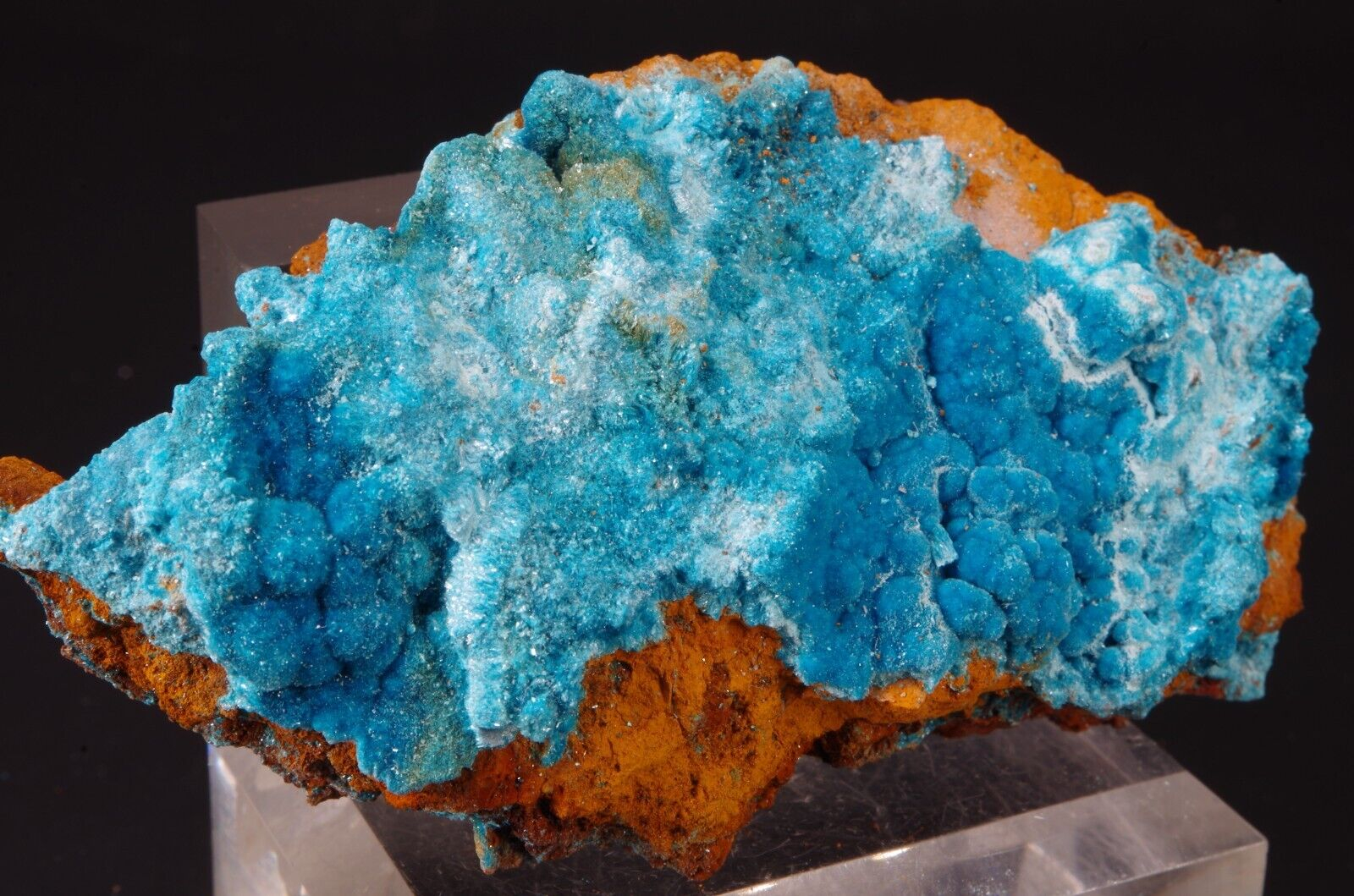Rare sky-blue coloured hydrated sulfate mineral, often found as a post-mining product.