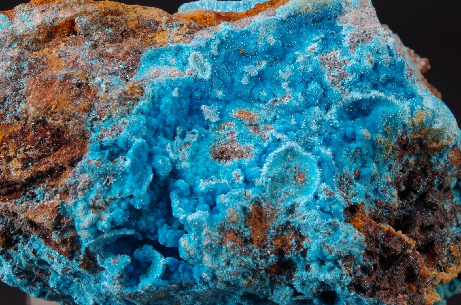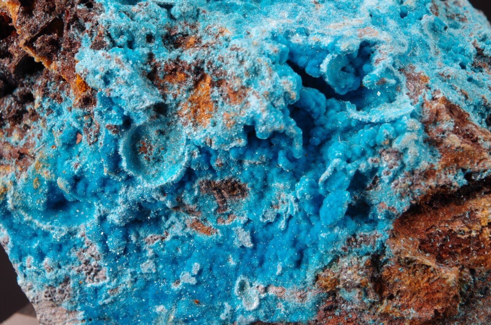 Rare sky-blue coloured hydrated sulfate mineral, often found as a post-mining product.