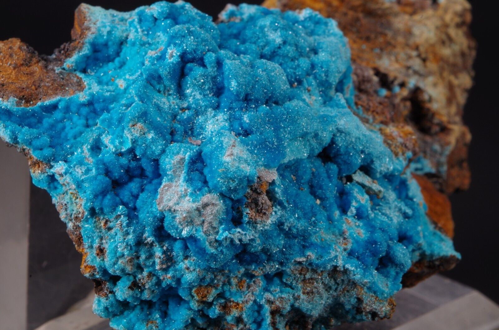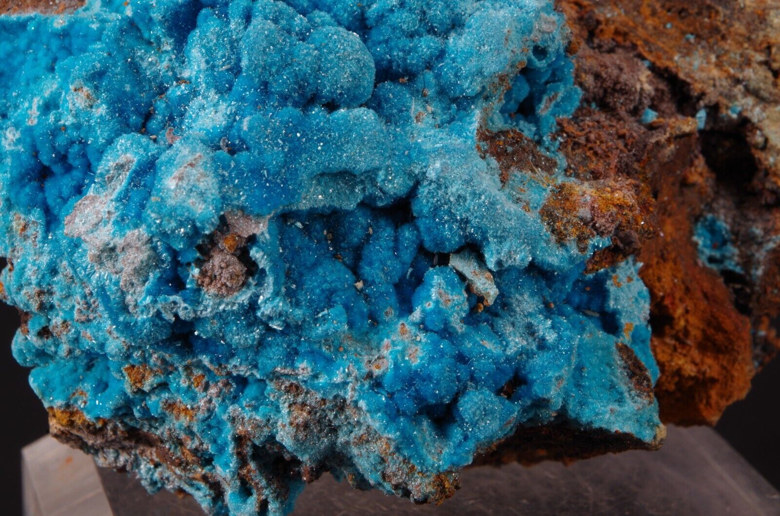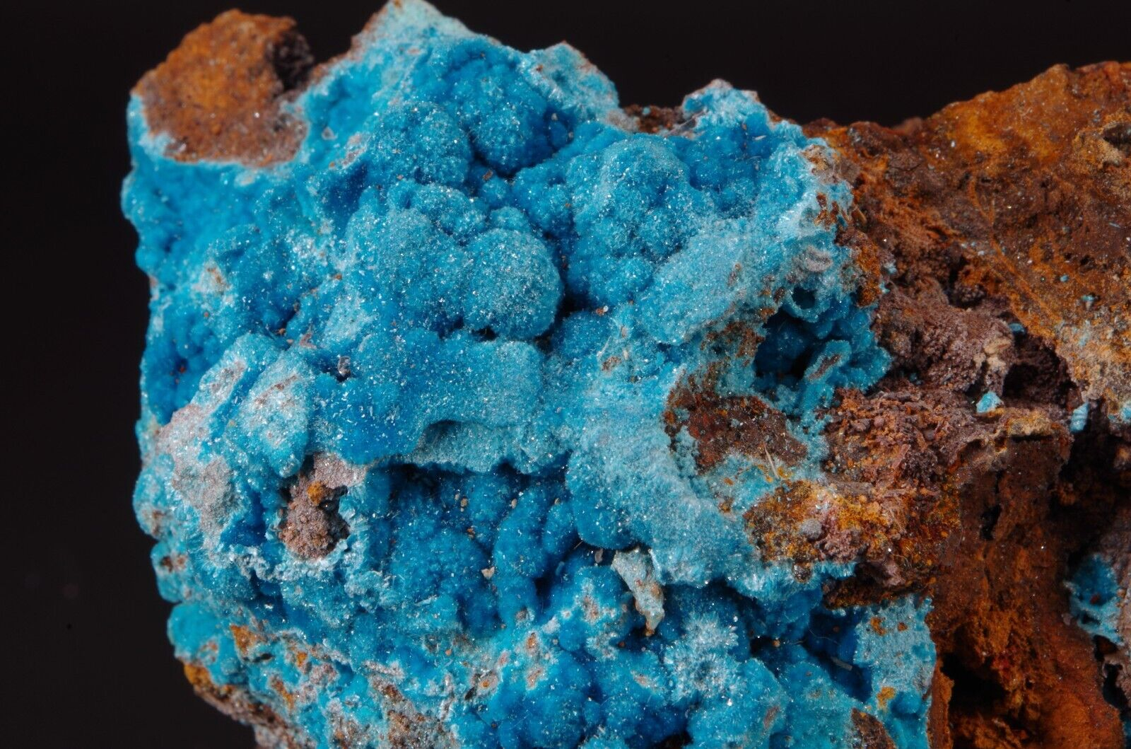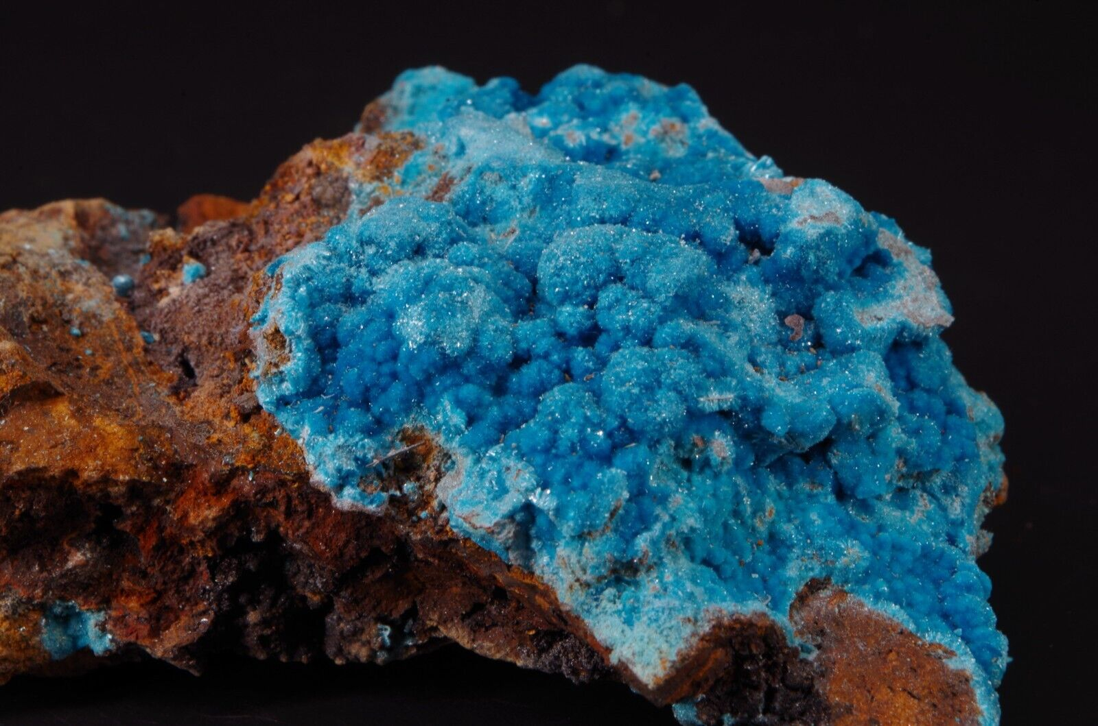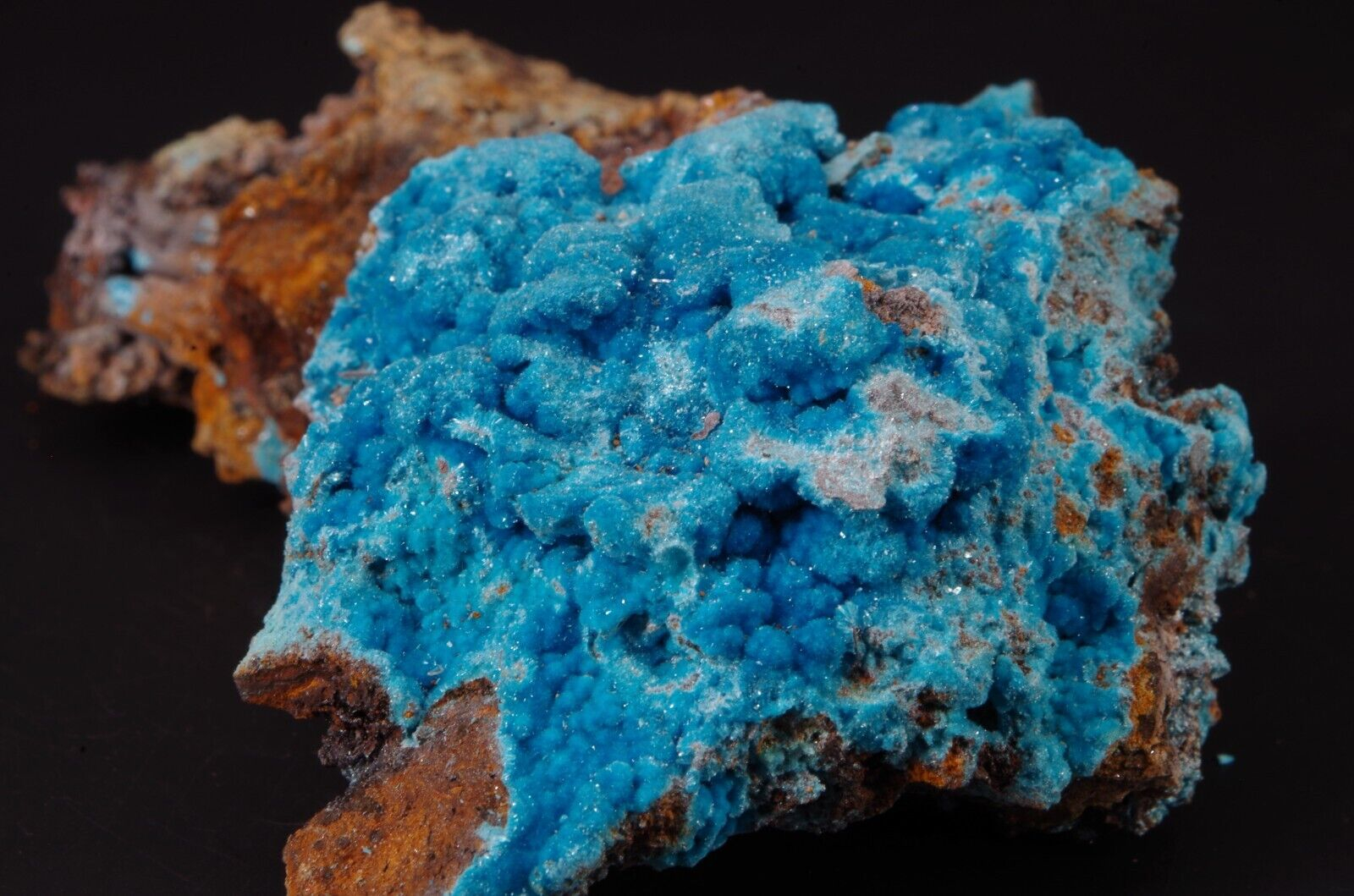 Rare sky-blue coloured hydrated sulfate mineral, often found as a post-mining product.