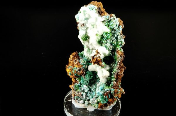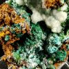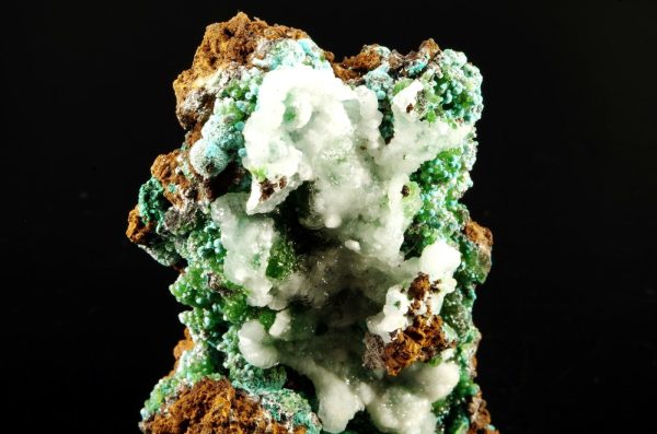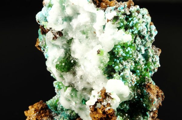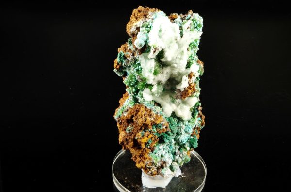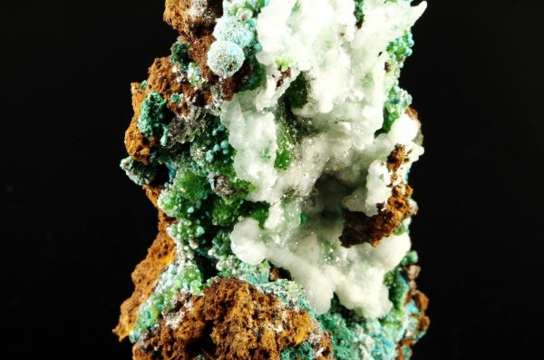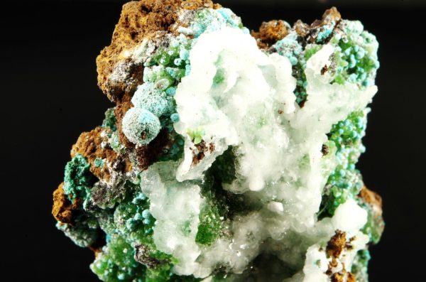 Excellente combinaison composée sur la face avant de Cupro-Smithsonite, Malachite et Rosasite bleue globulaire recouverts partiellement de Calcite blanche offrant un super contraste.