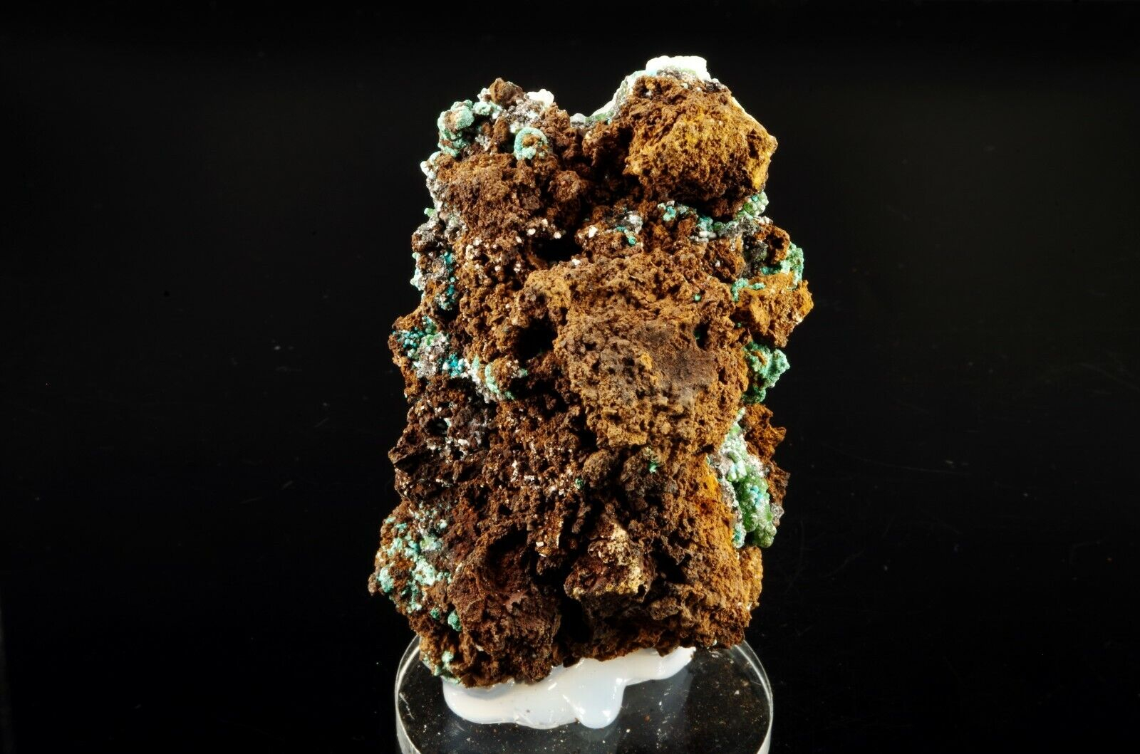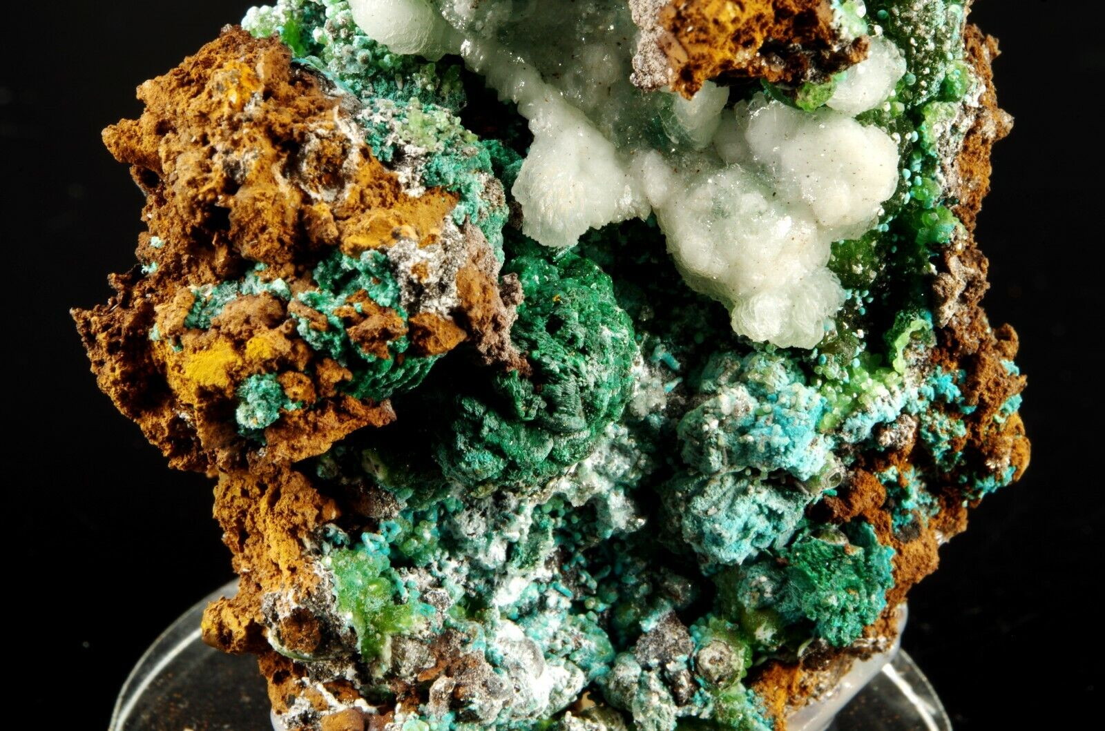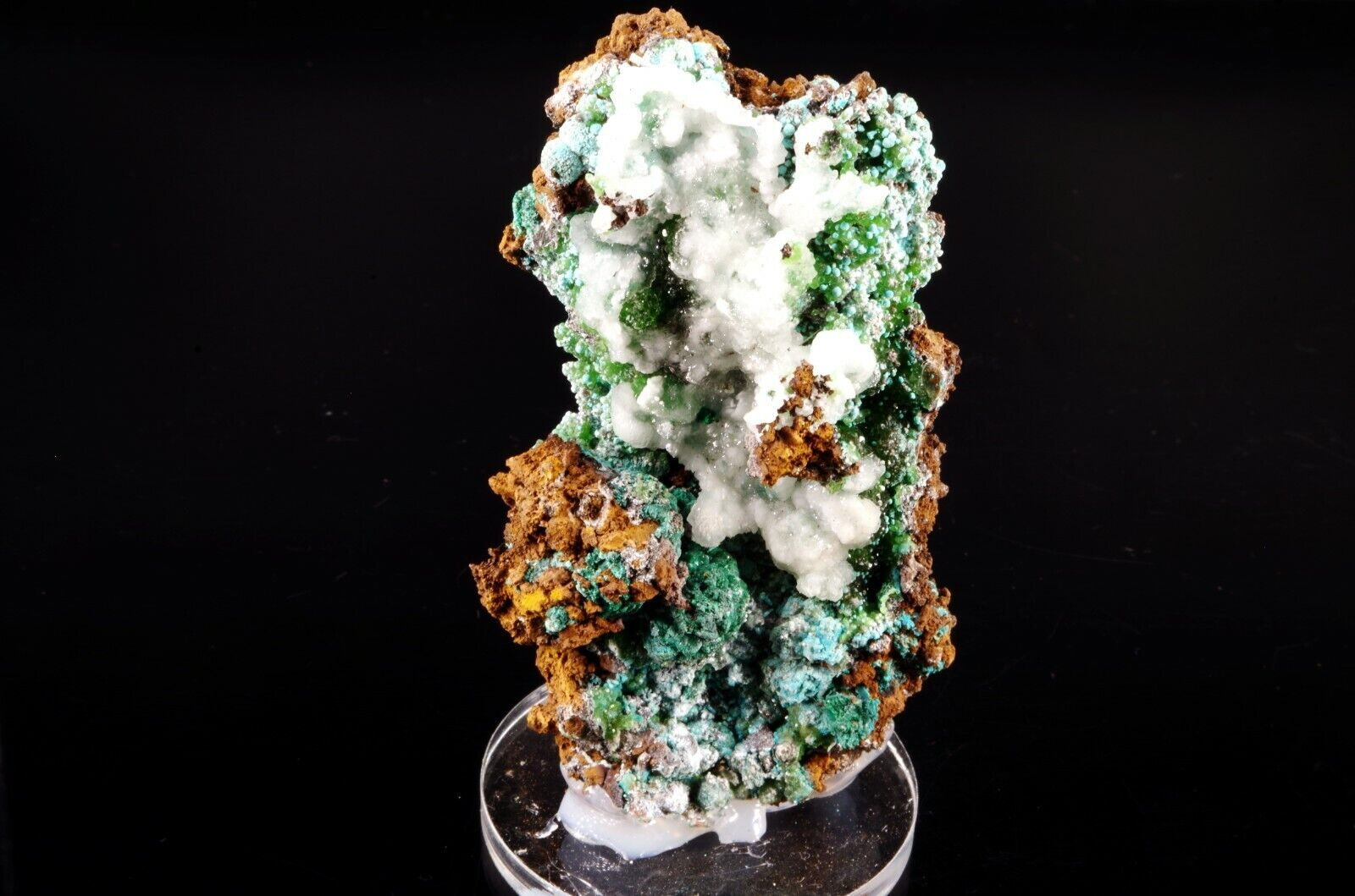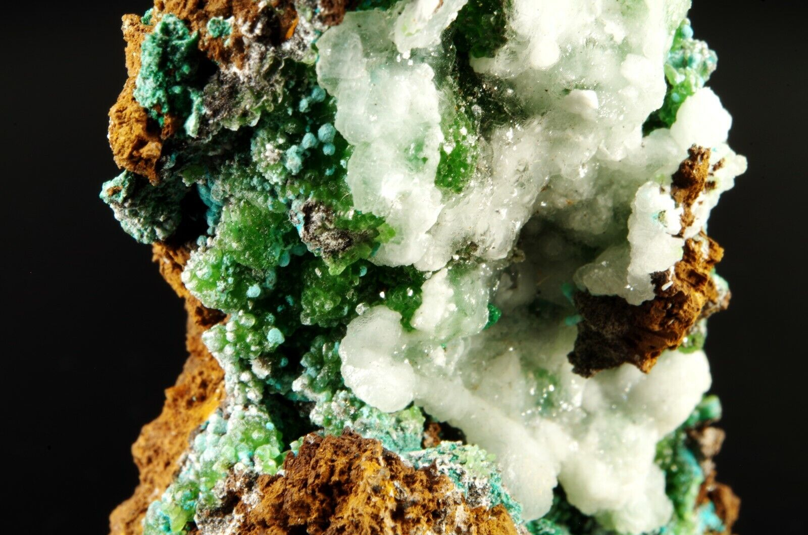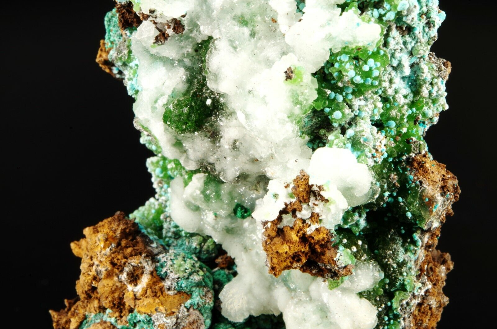 Excellente combinaison composée sur la face avant de Cupro-Smithsonite, Malachite et Rosasite bleue globulaire recouverts partiellement de Calcite blanche offrant un super contraste.