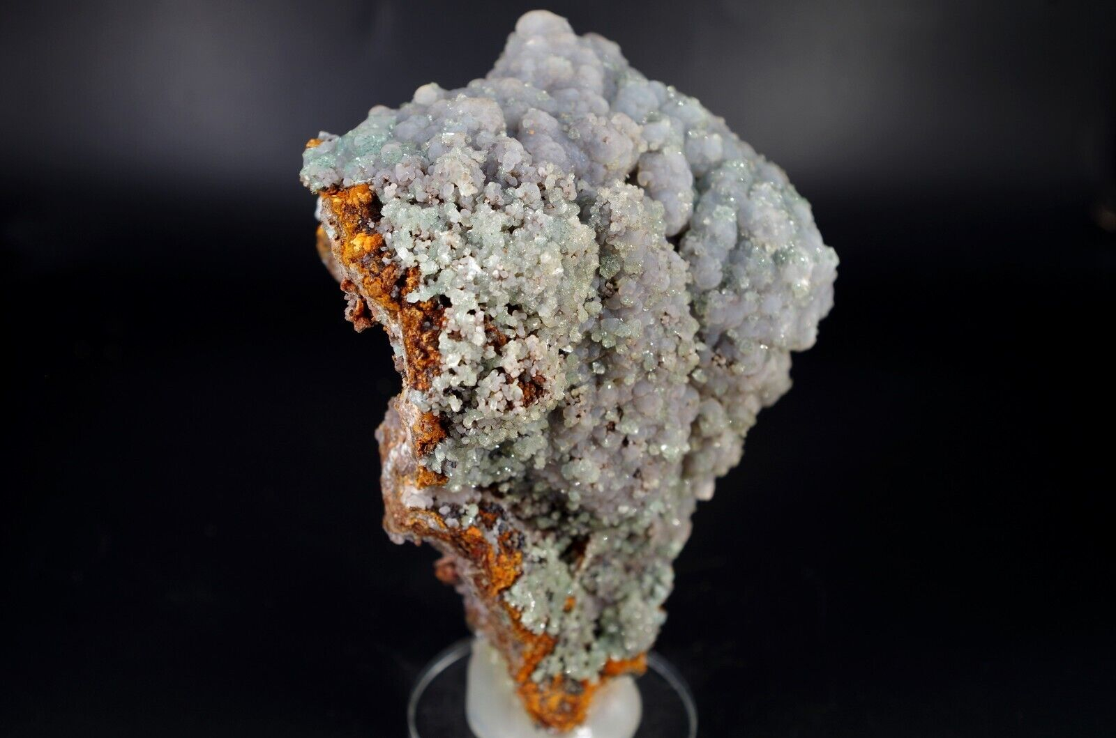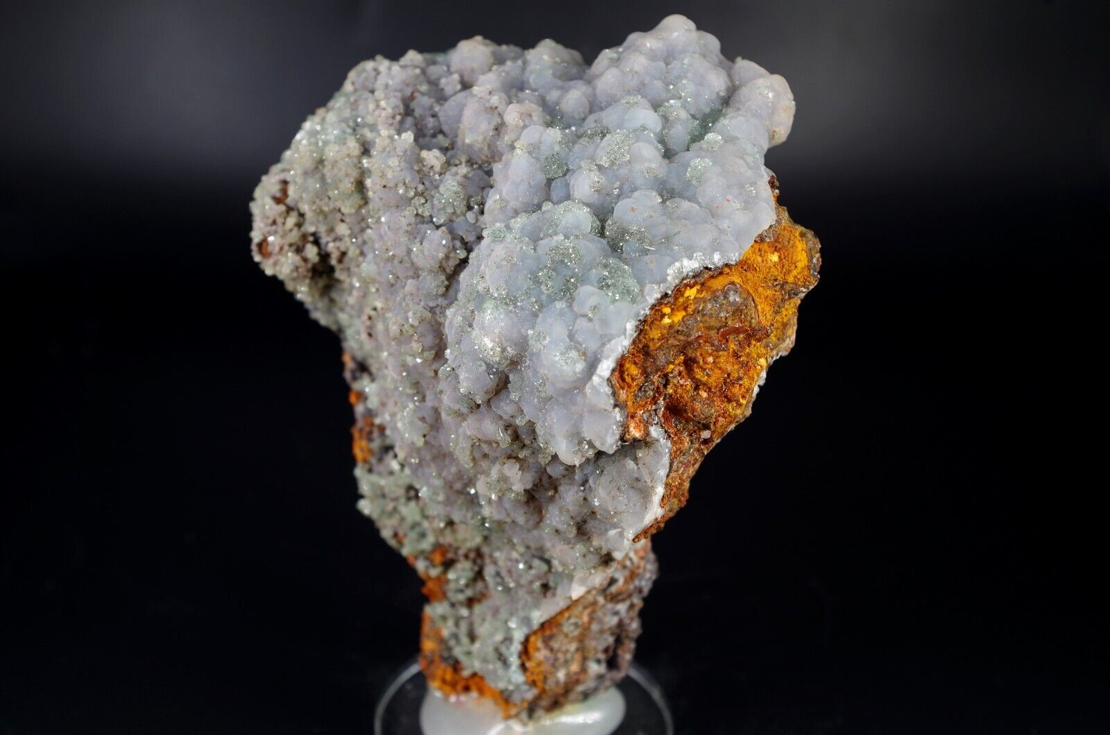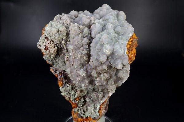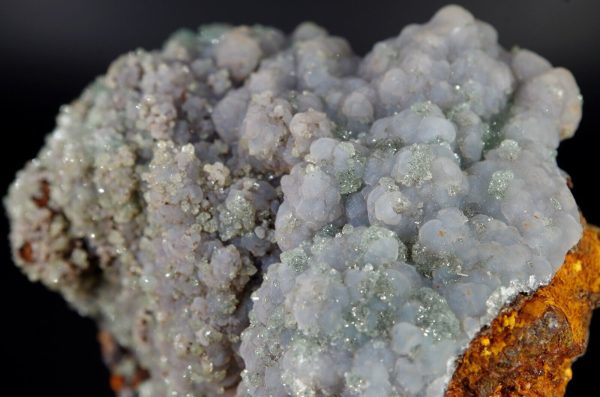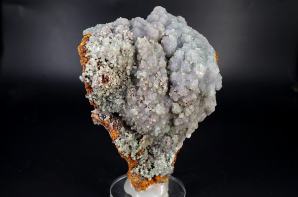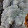 D’aspect botryoidal tel que la calcédoine d’Indonésie avec aux couleurs bleu/lavande pale avec une seconde cristallisation vert d’eau brillante.