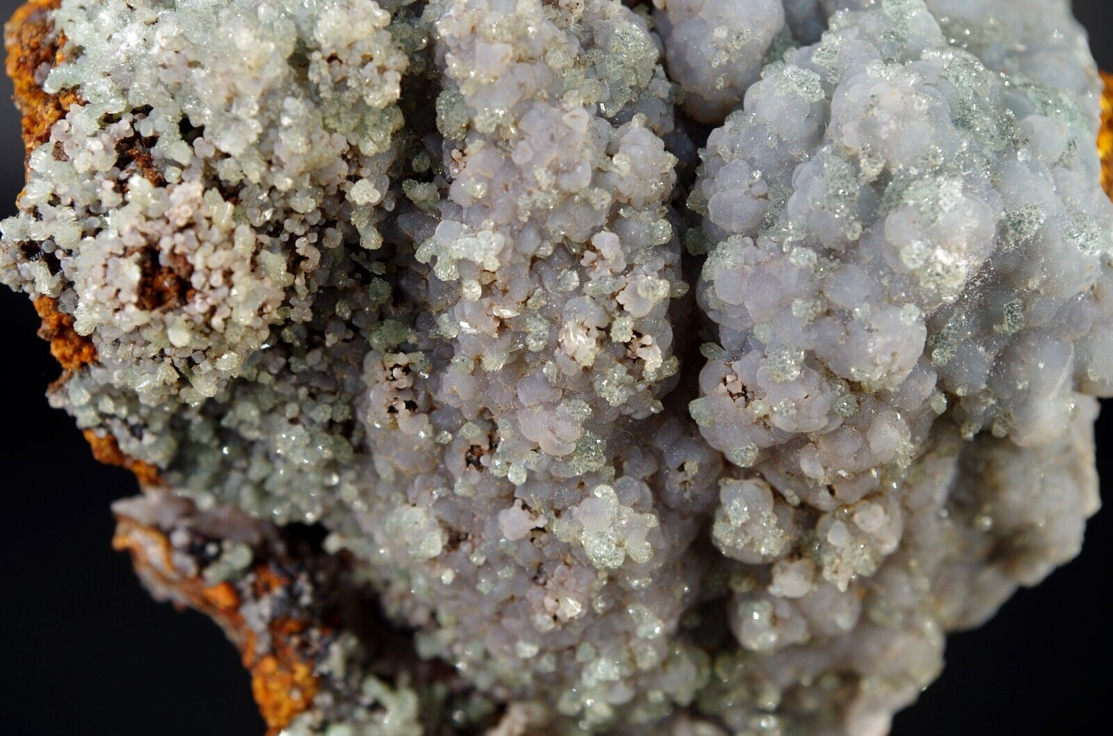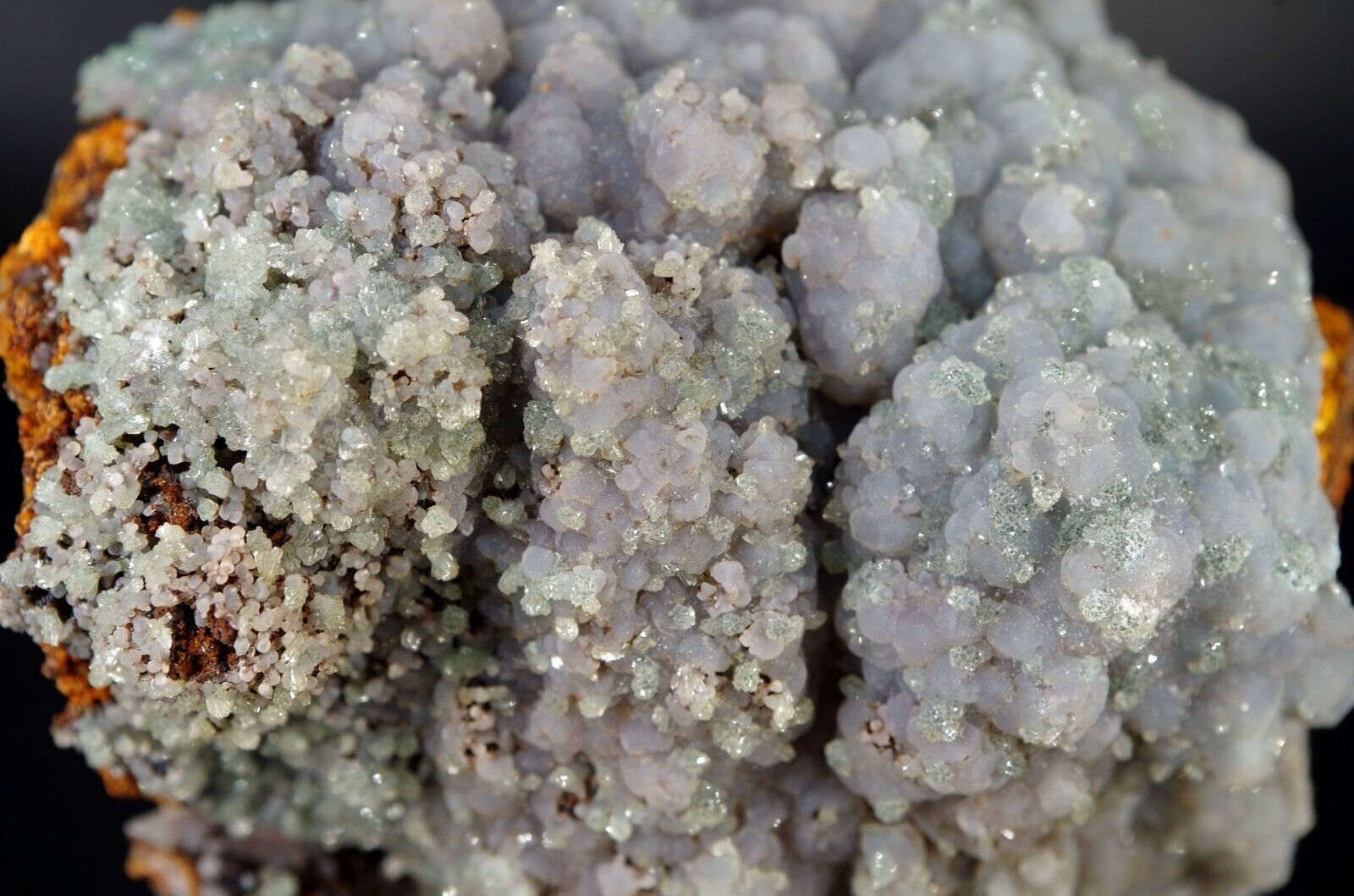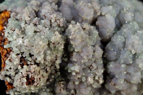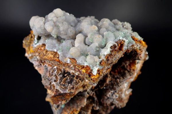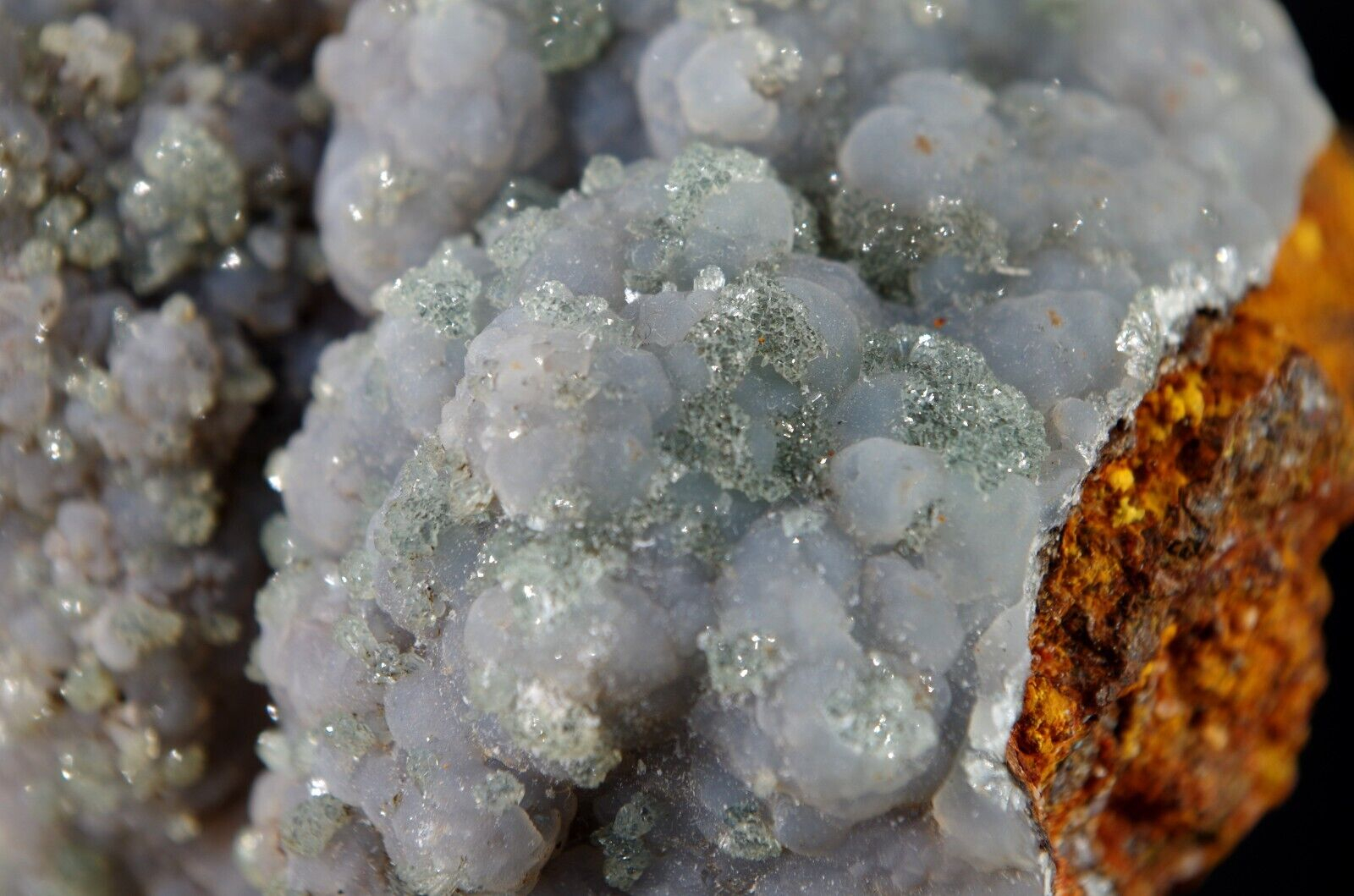 D’aspect botryoidal tel que la calcédoine d’Indonésie avec aux couleurs bleu/lavande pale avec une seconde cristallisation vert d’eau brillante.