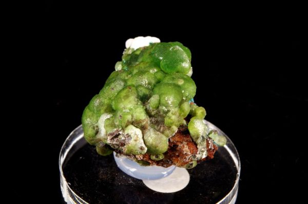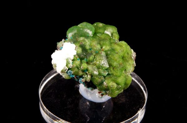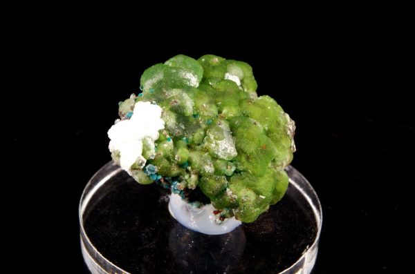 Magnifique combinaison de Cupro-Smithsonite lustrée vert vif parsemée de Rosasite bleue et recouvert d’une formation de calcite blanche