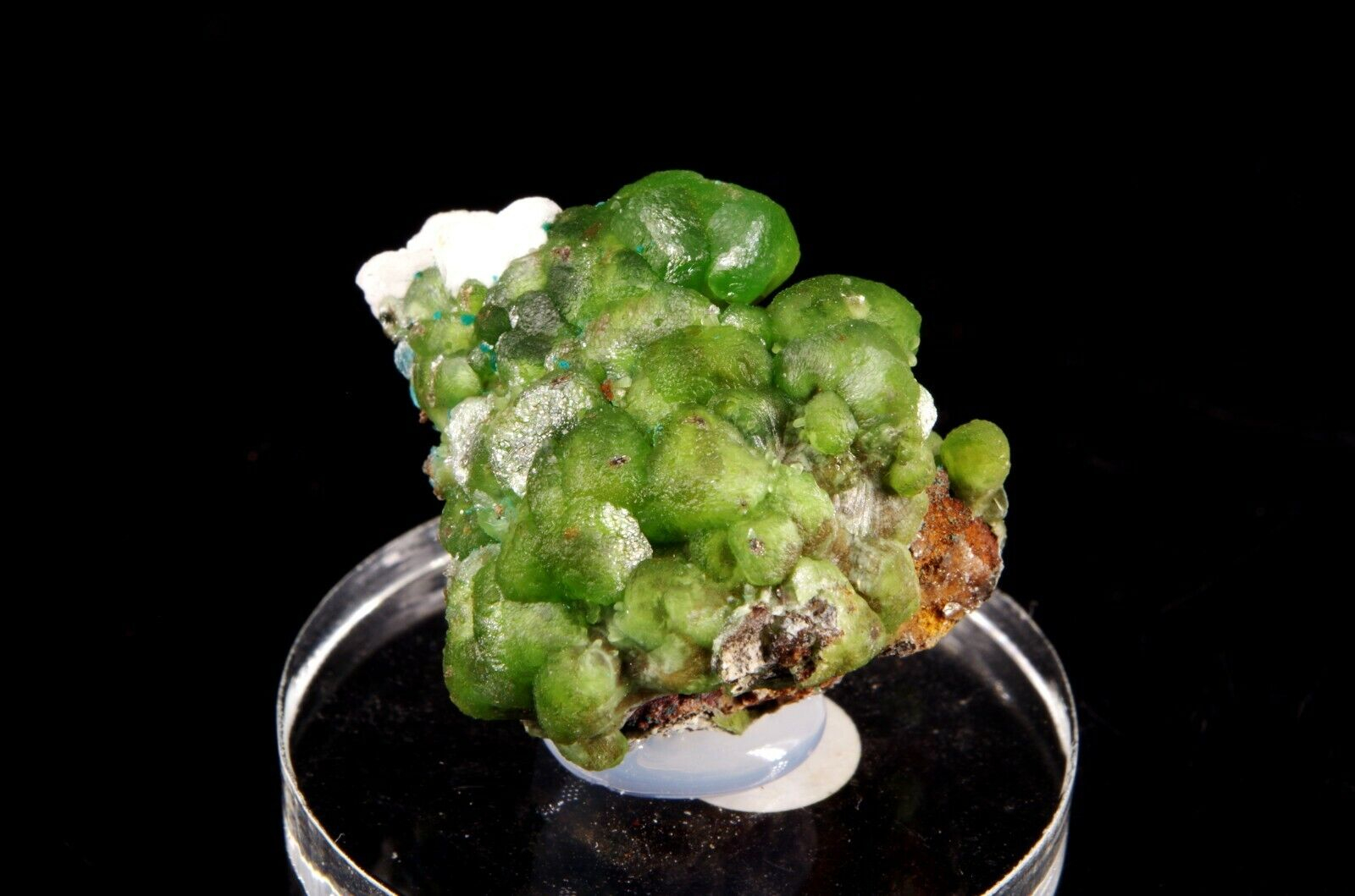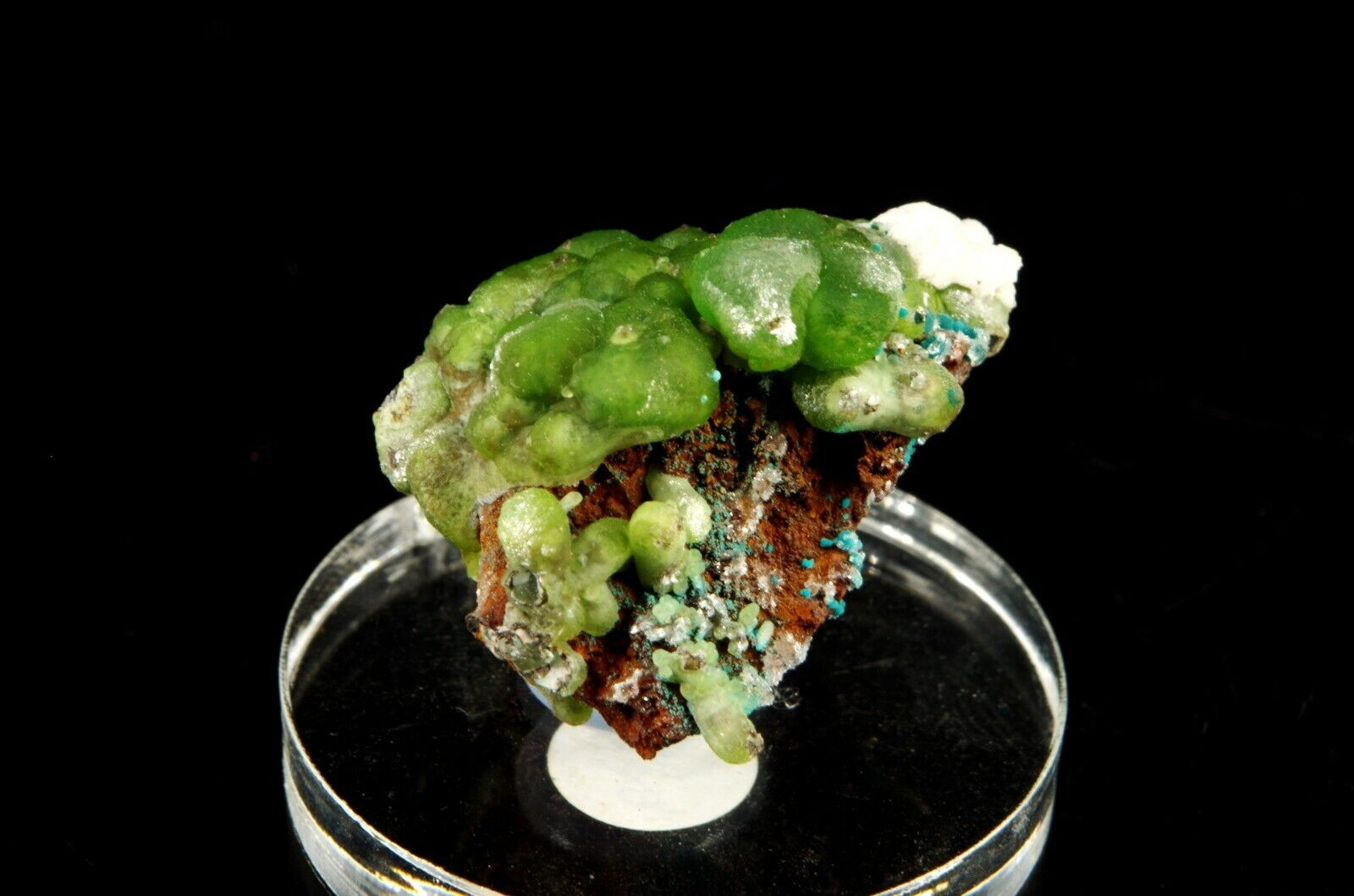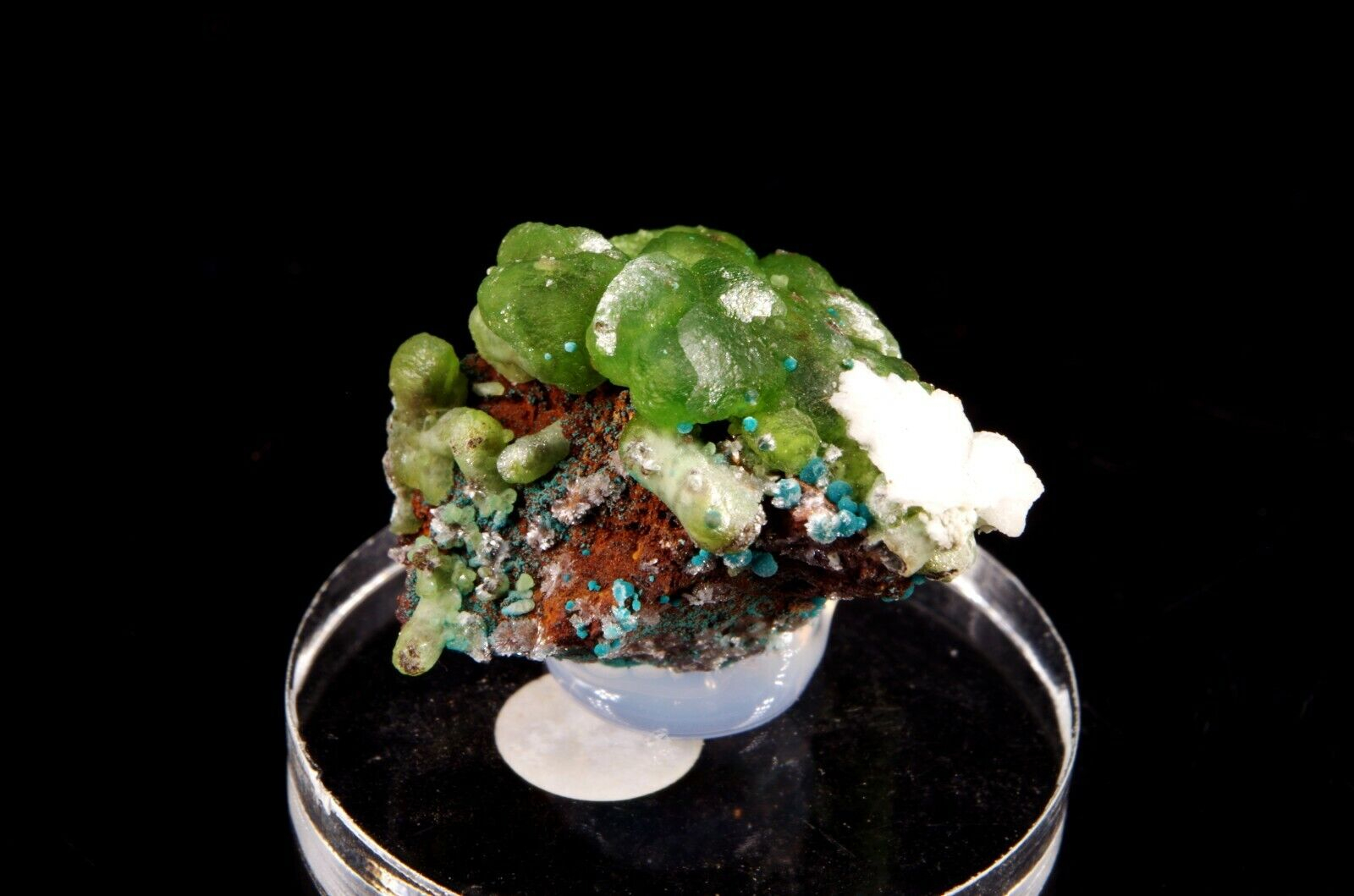 Magnifique combinaison de Cupro-Smithsonite lustrée vert vif parsemée de Rosasite bleue et recouvert d’une formation de calcite blanche