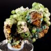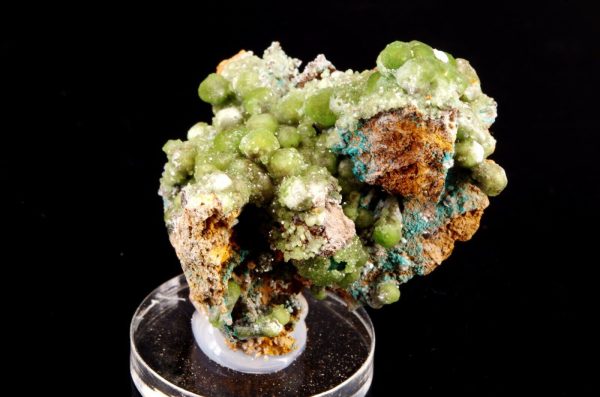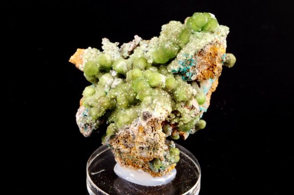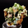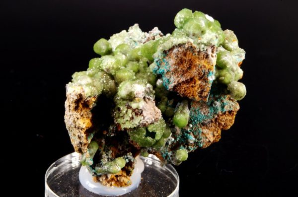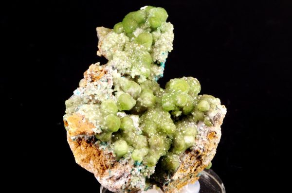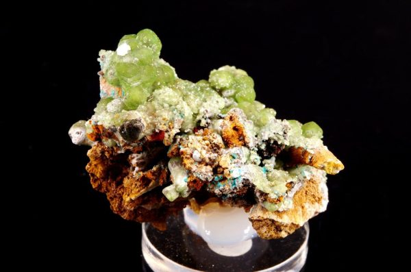 Combinaison de Cupro-Smithsonite lustrée d’aspect bortrydoïdal et Hémimorphite apparaissant comme un « glaçage ». Quelques formations mineures de Rosasite bleue parsèment le spécimen