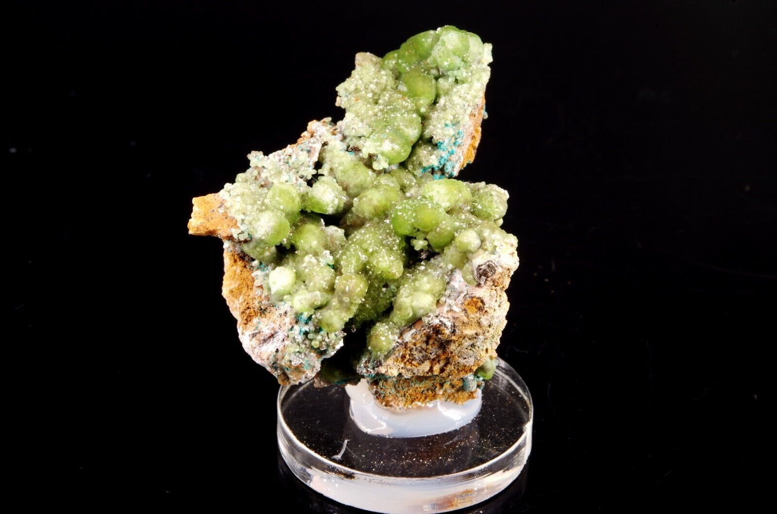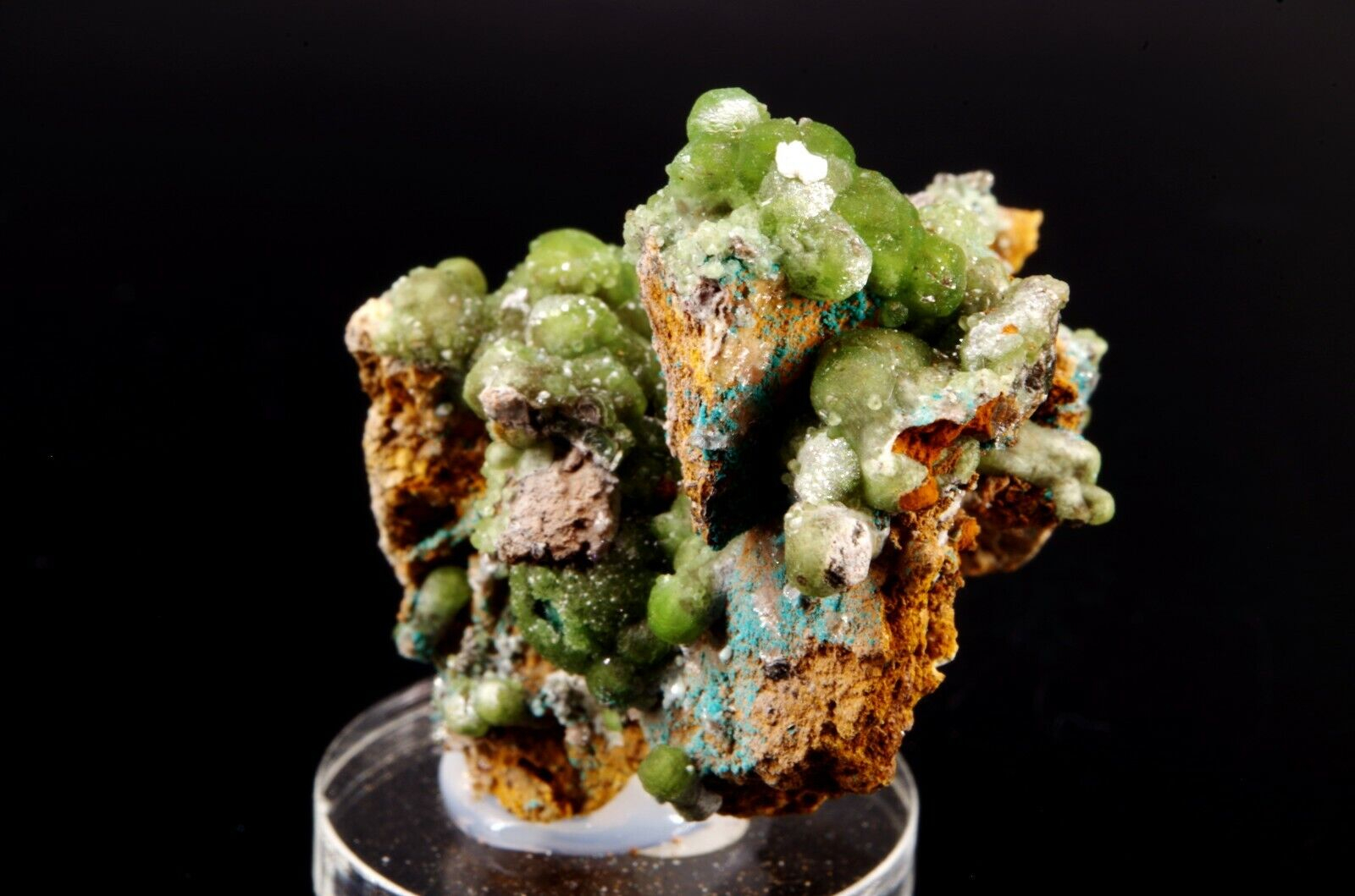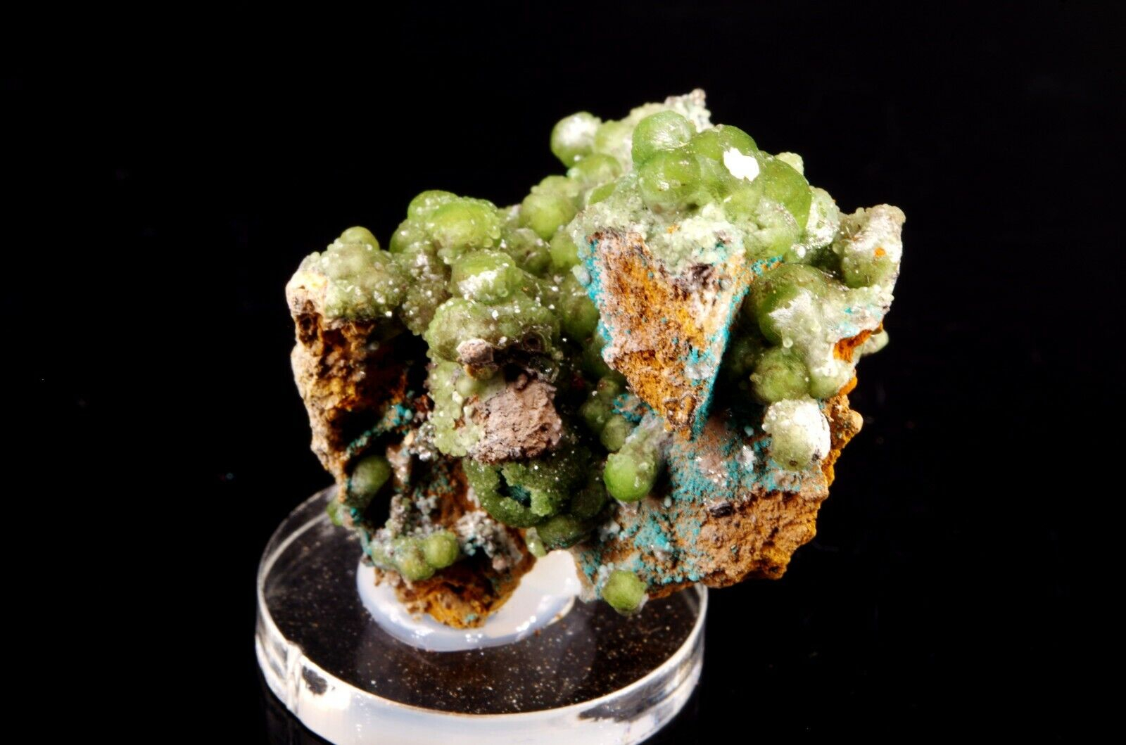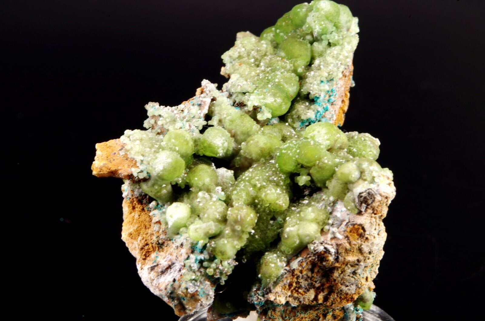 Combinaison de Cupro-Smithsonite lustrée d’aspect bortrydoïdal et Hémimorphite apparaissant comme un « glaçage ». Quelques formations mineures de Rosasite bleue parsèment le spécimen