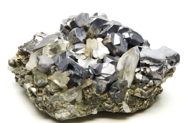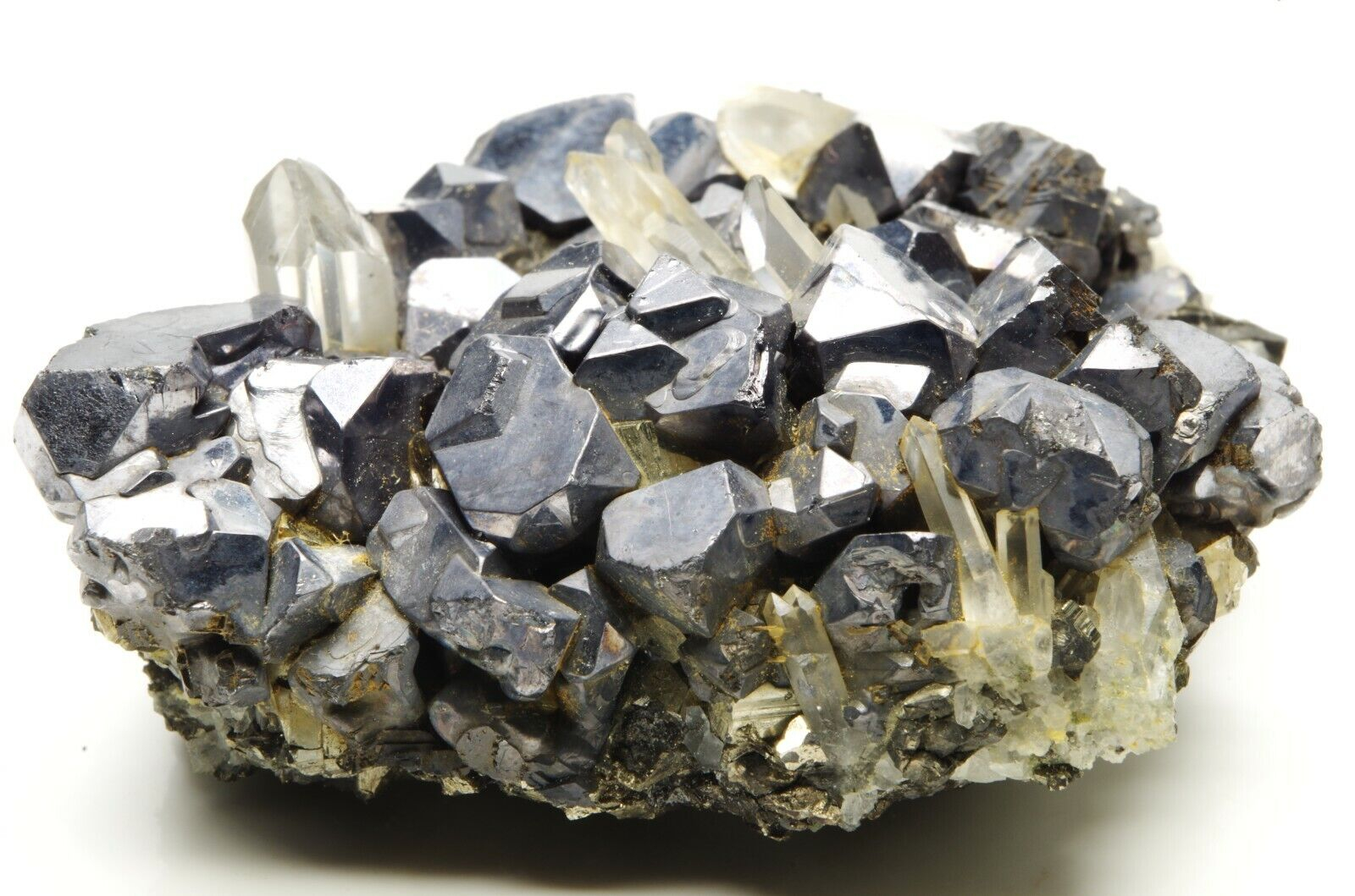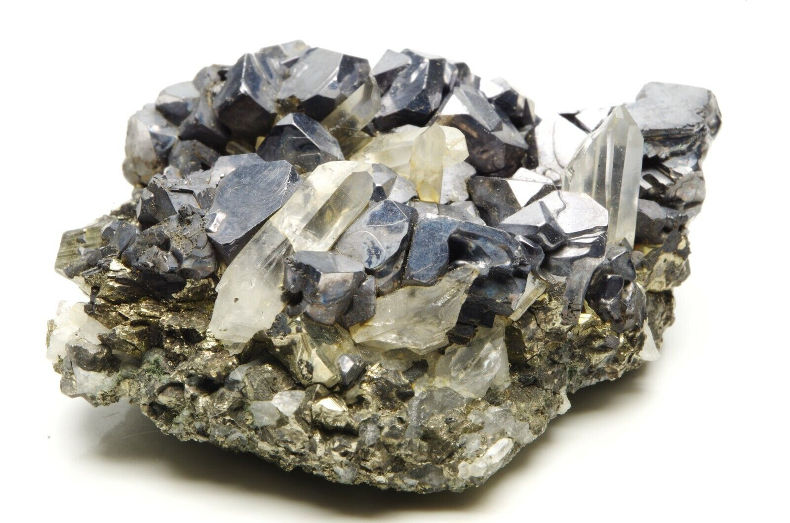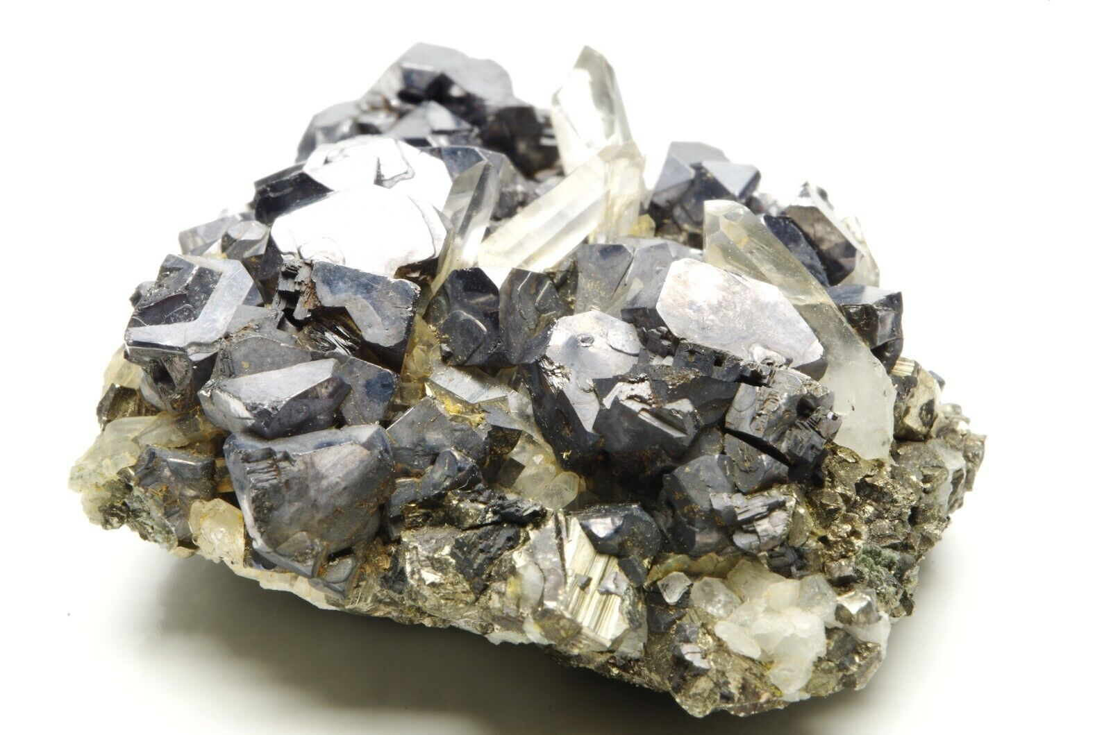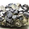 Nombreux cristaux de sphalérites aux reflets métalliques / argentés et brillants disposés sur matrice en pyrite et parsemé de petits cristaux de quartz limpides en parfaite condition