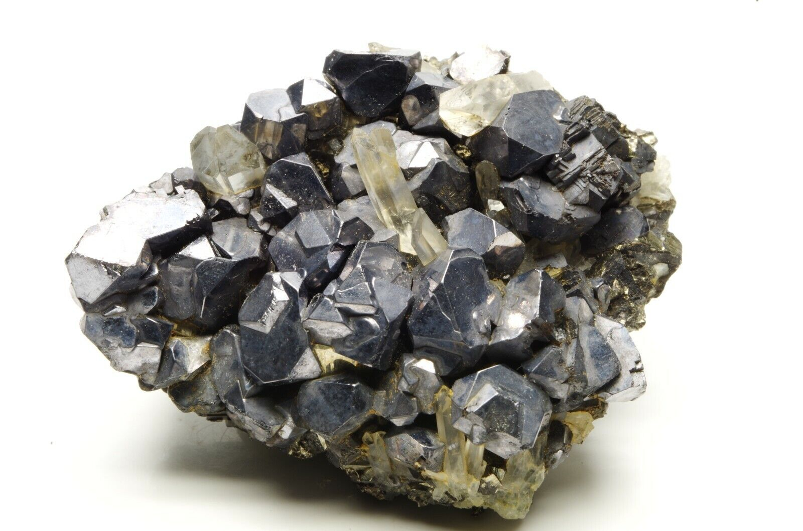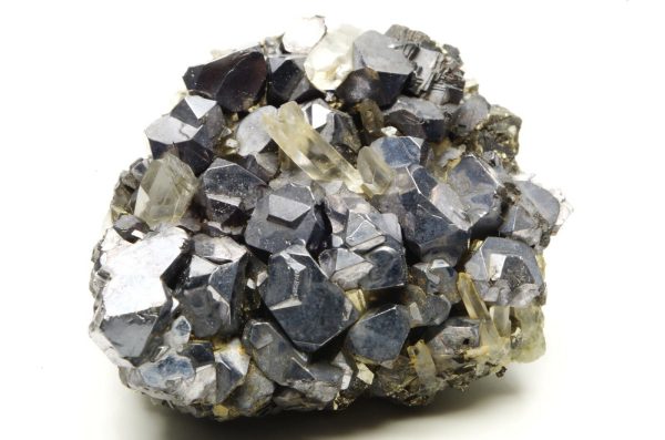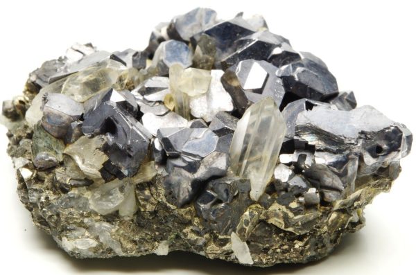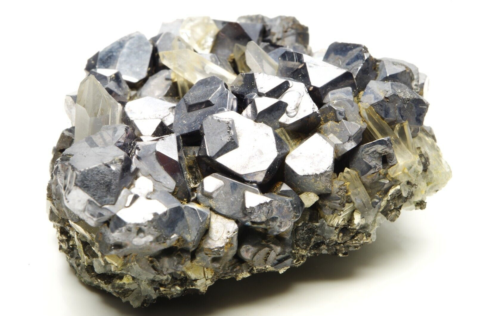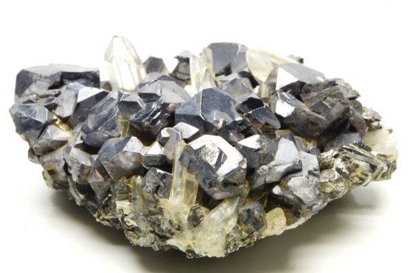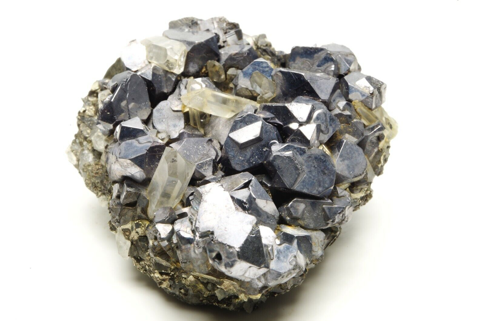 Nombreux cristaux de sphalérites aux reflets métalliques / argentés et brillants disposés sur matrice en pyrite et parsemé de petits cristaux de quartz limpides en parfaite condition