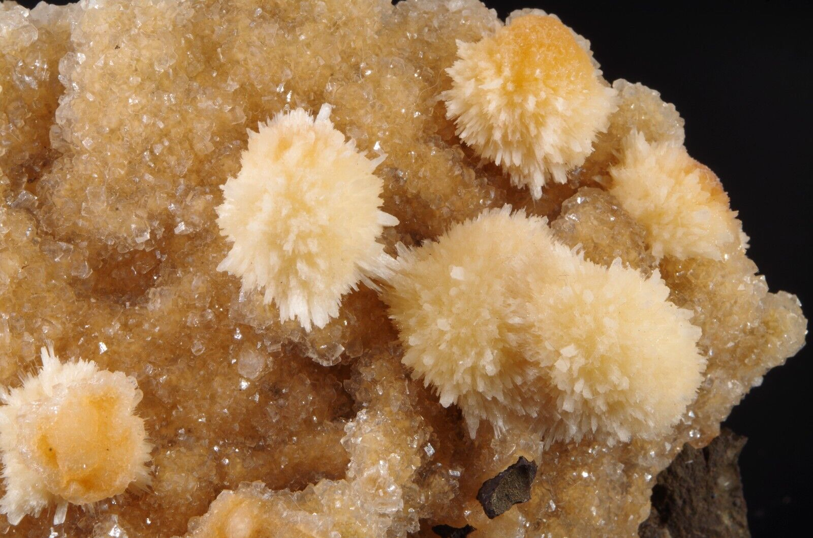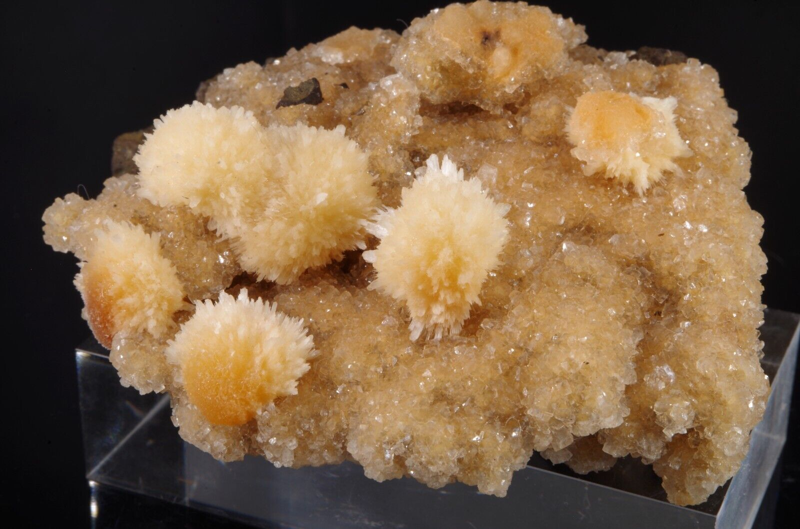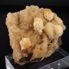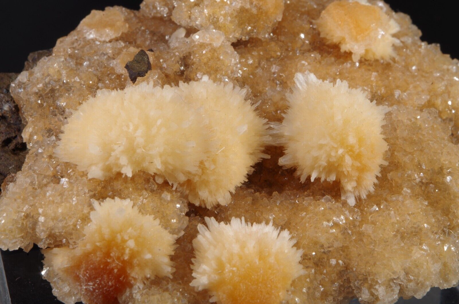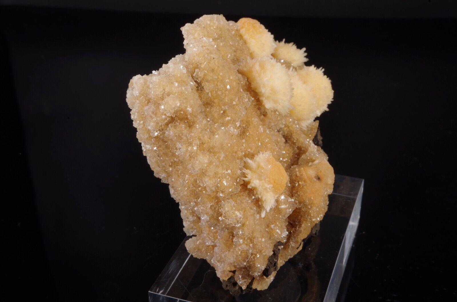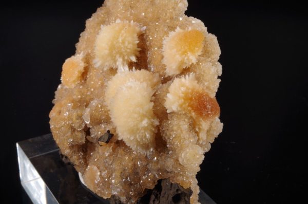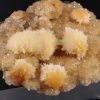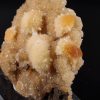 Jolie formation de Thomsonite jaune pêche fibro-radiée disposée sur matrice de basalte recouverte par de la Heulandite