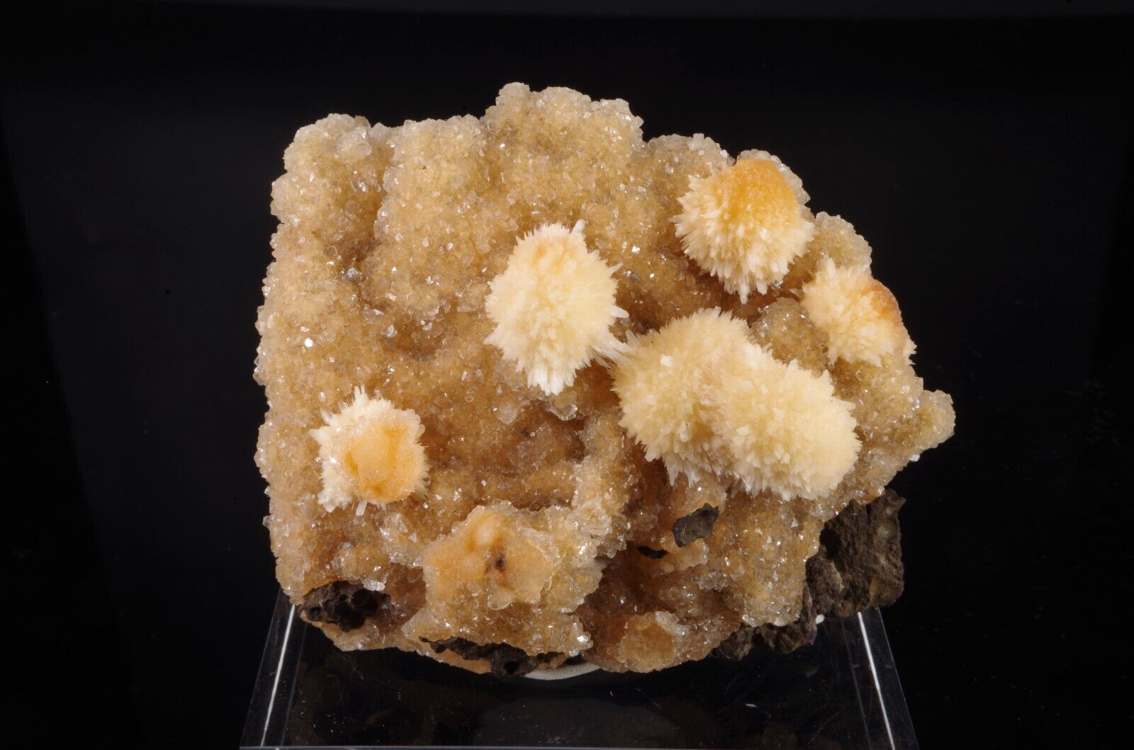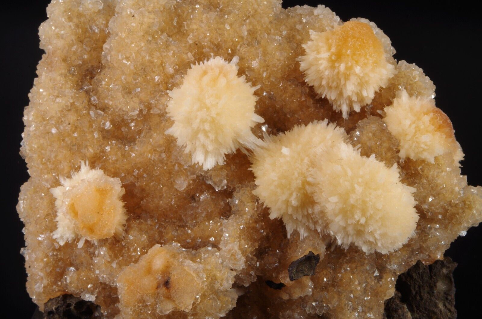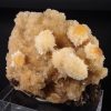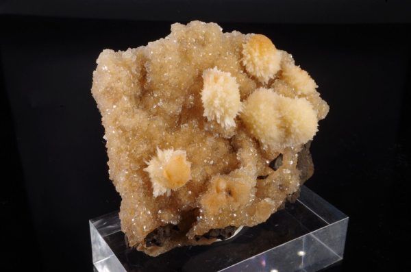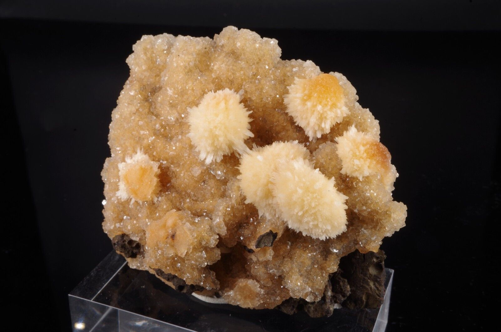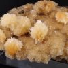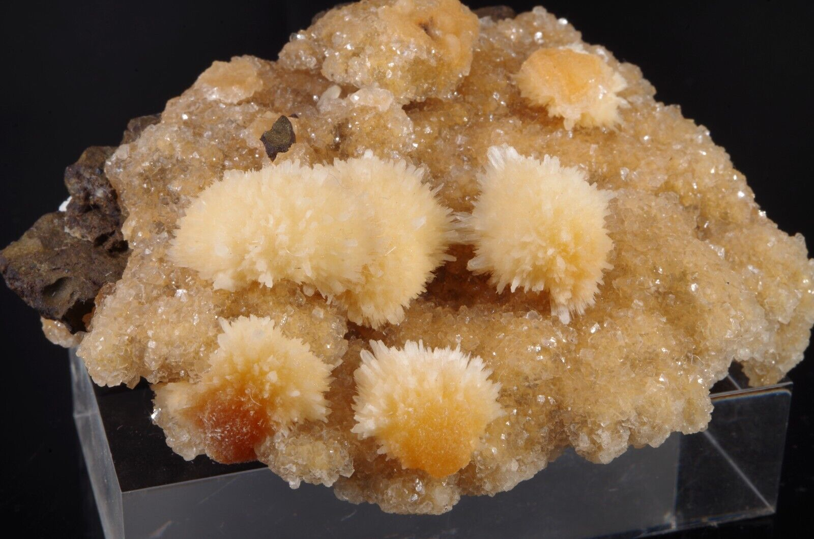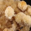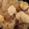 Jolie formation de Thomsonite jaune pêche fibro-radiée disposée sur matrice de basalte recouverte par de la Heulandite