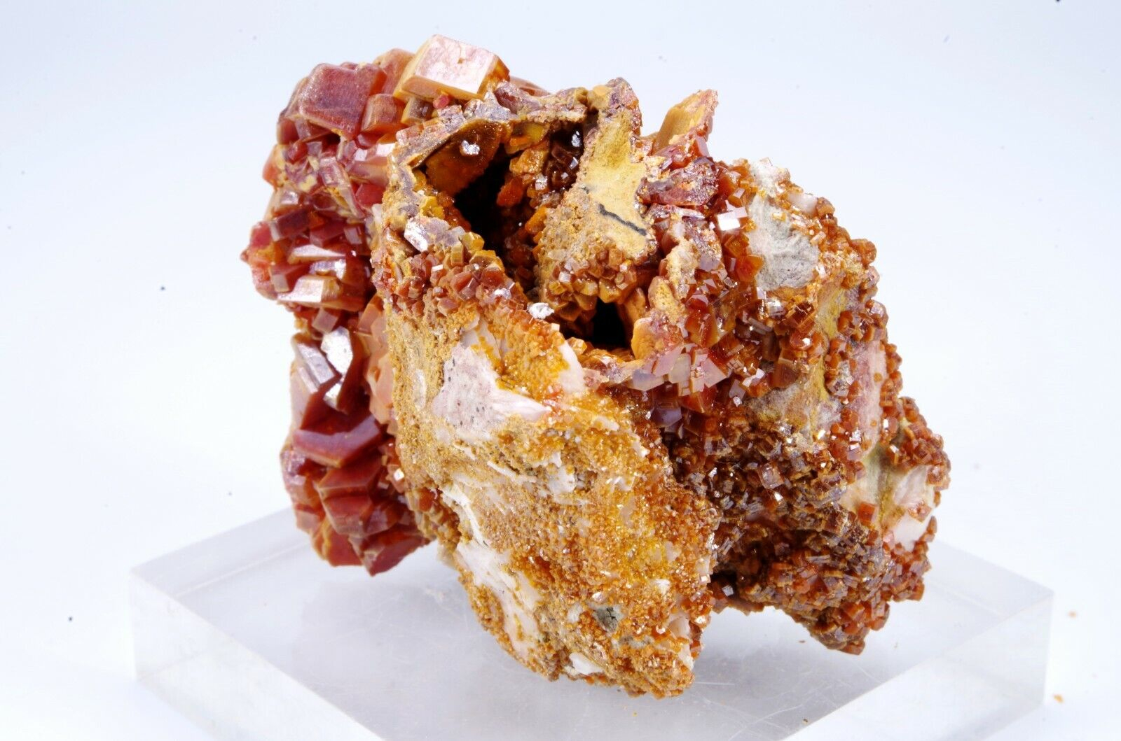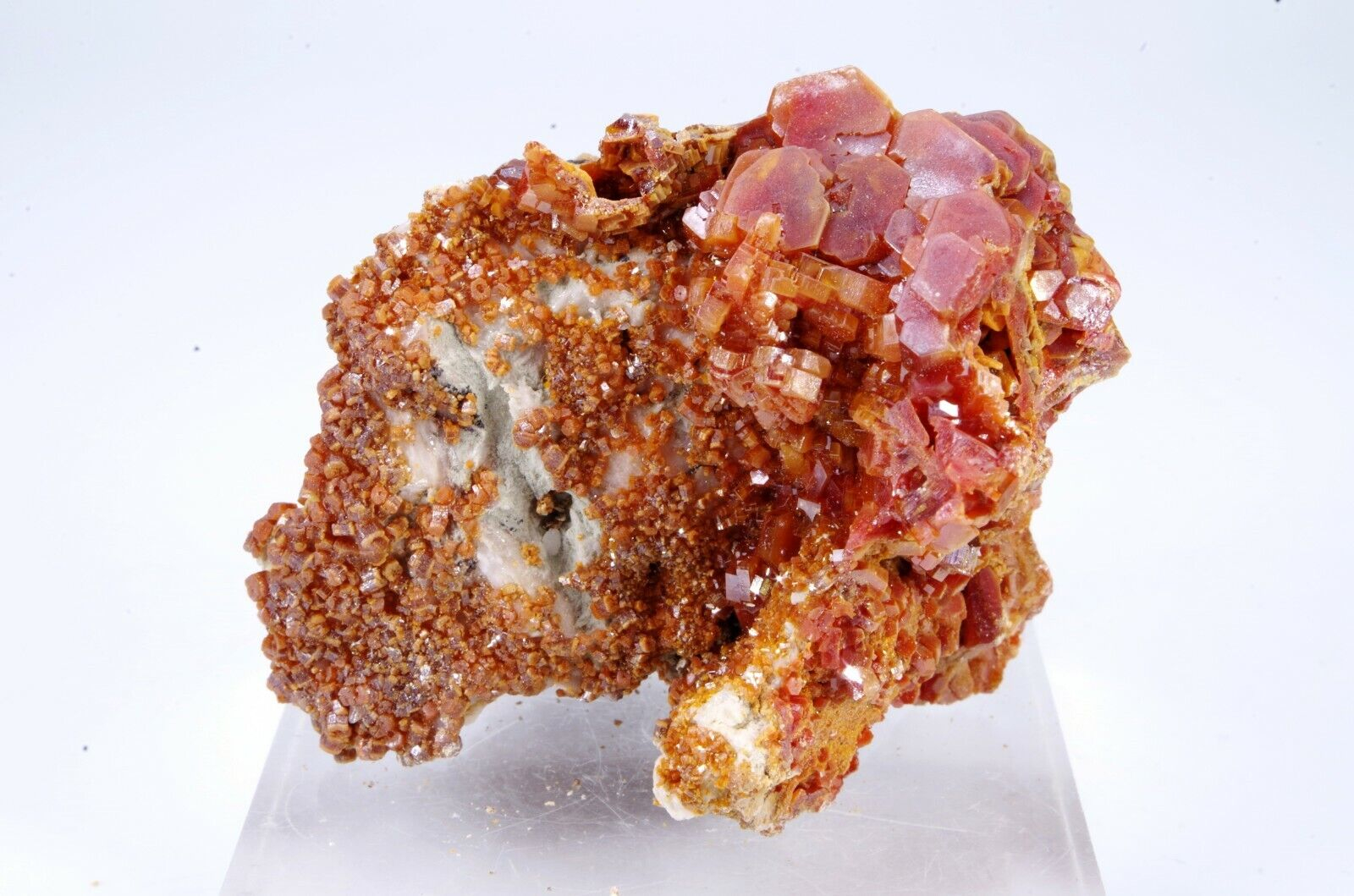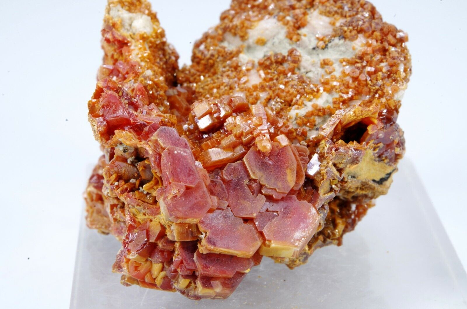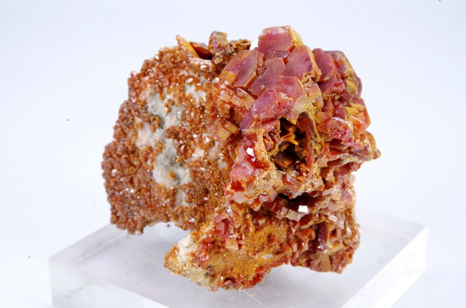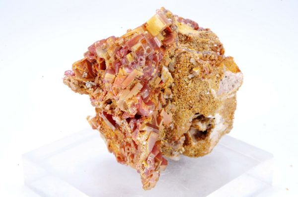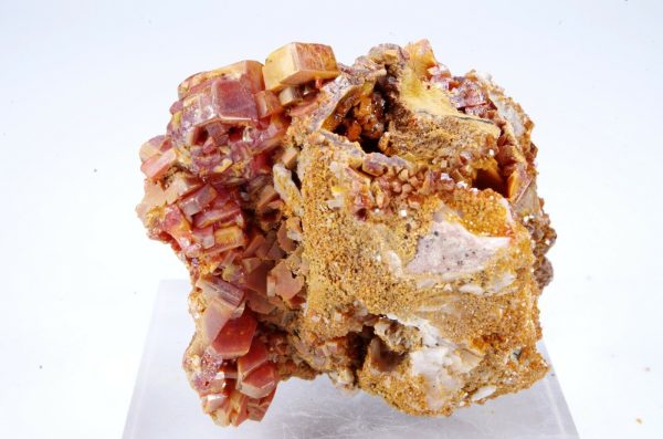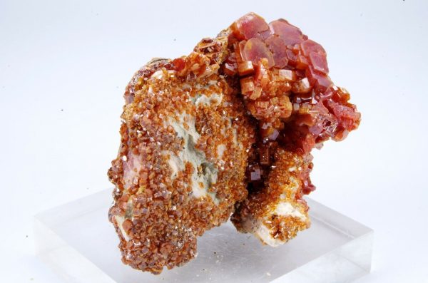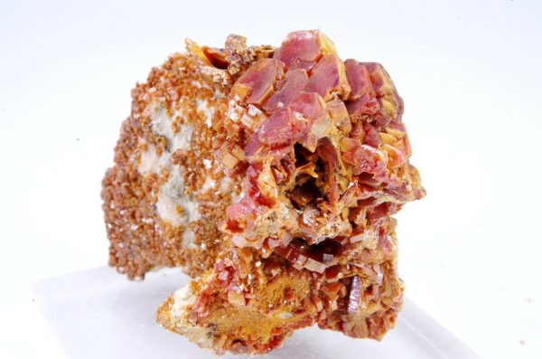 Jolie cristallisation de Vanadinite rouge orangée sur gangue